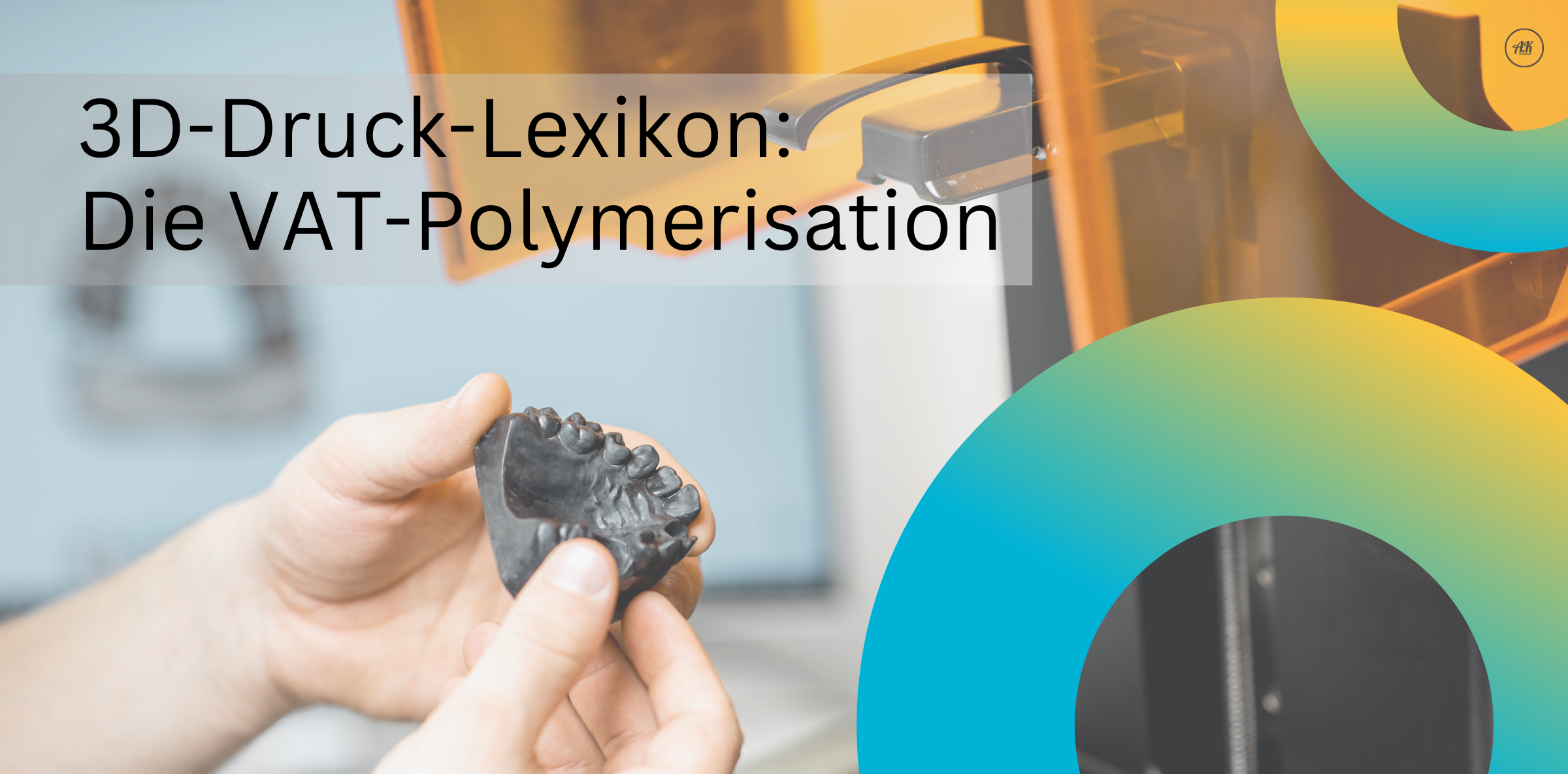 VAT-Polymerisation ist der Fachbegriff für den 3D-Resin-Druck. In einer Wanne (englisch „vat“) befindet sich flüssiges Harz, das durch Licht schichtweise gehärtet wird. Die einzelnen Schichten verbinden sich durch Polymerisation.